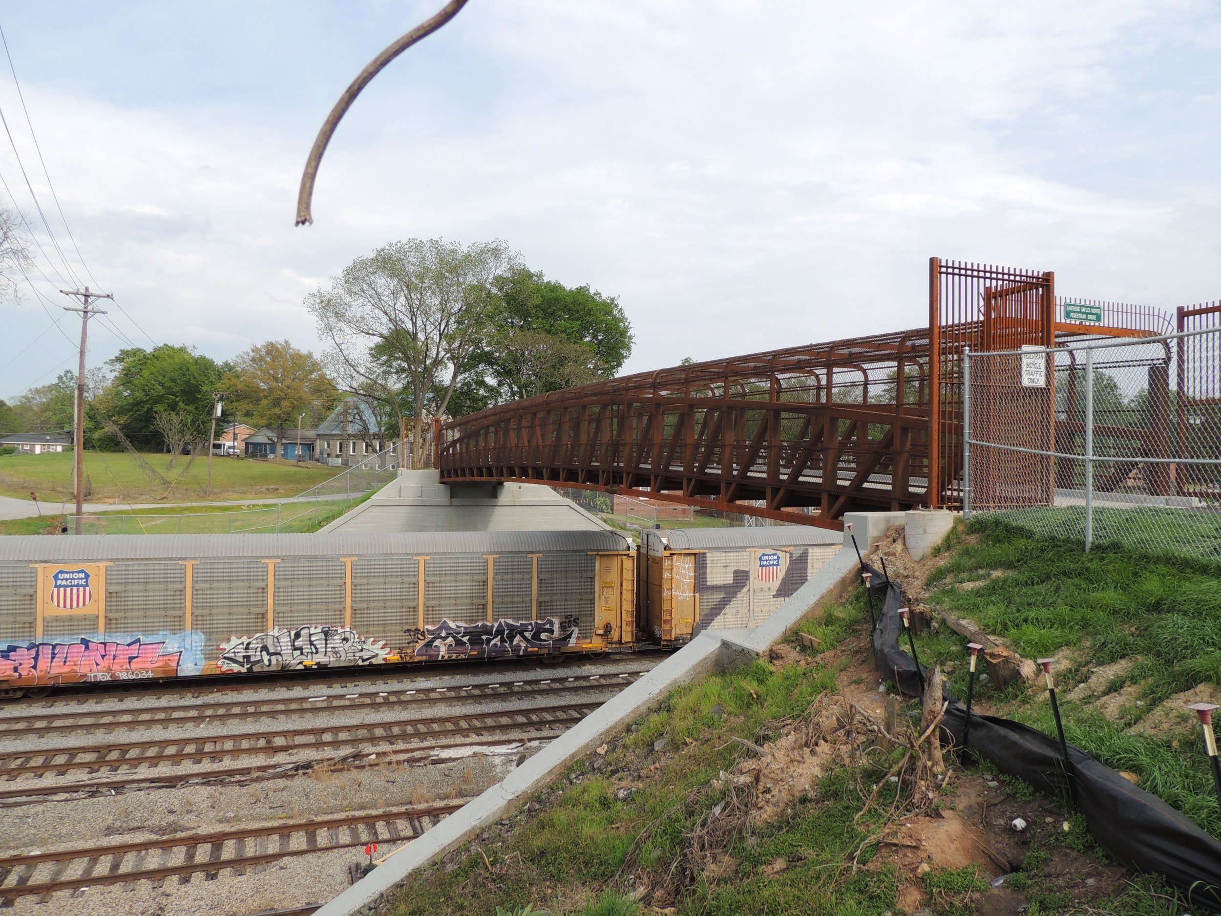 The 162 ft single-span pedestrian truss spanned 9 active tracks in the NSRR yard, west of downtown Greenville, SC.